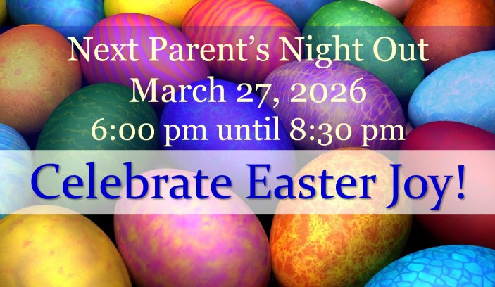 Parent's Night Out makes learning fun and helps children develop balanced social skills. The evening is usually based around a theme, and will include some combination of games, crafts, movies, snacks, and more. This is a great opportunity for your child to build friendships in a safe, supervised setting while you take a little time off. Check the monthly newsletter for more specific event information!